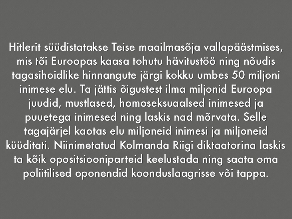 Hitlerit süüdistatakse Teise maailmasõja vallapäästmises, mis tõi Euroopas kaasa tohutu hävitustöö ning nõudis tagasihoidlike hinnangute järgi kokku umbes 50 miljoni inimese elu. Ta jättis õigustest ilma miljonid Euroopa juudid, mustlased, homoseksuaalsed inimesed ja puuetega inimesed ning laskis nad mõrvata. Selle tagajärjel kaotas elu miljoneid inimesi ja miljoneid küüditati. Niinimetatud Kolmanda Riigi diktaatorina laskis ta kõik opositsiooniparteid keelustada ning saata oma poliitilised oponendid koonduslaagrisse või tappa.