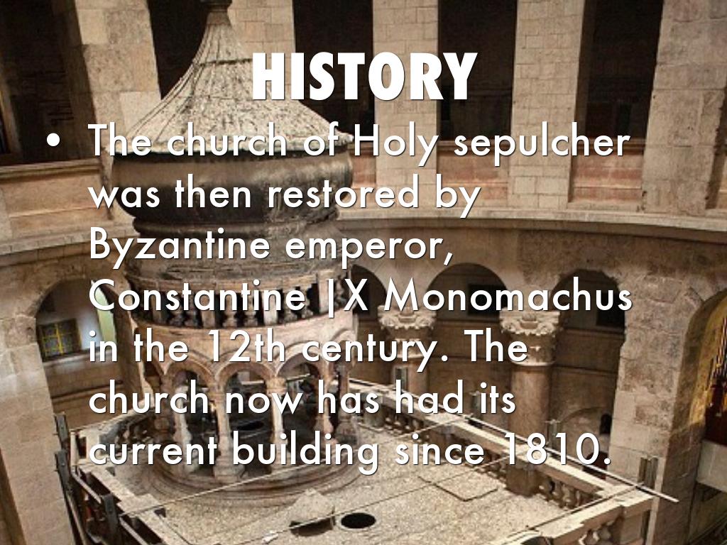 The church of Holy sepulcher was then restored by Byzantine emperor, Constantine |X Monomachus in the 12th century. The church now has had its current building since 1810.