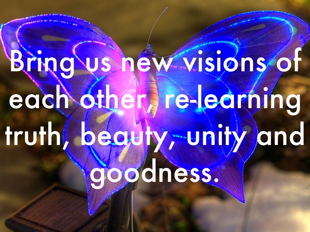 Bring us new visions of each other, re-learning truth, beauty, unity and goodness.