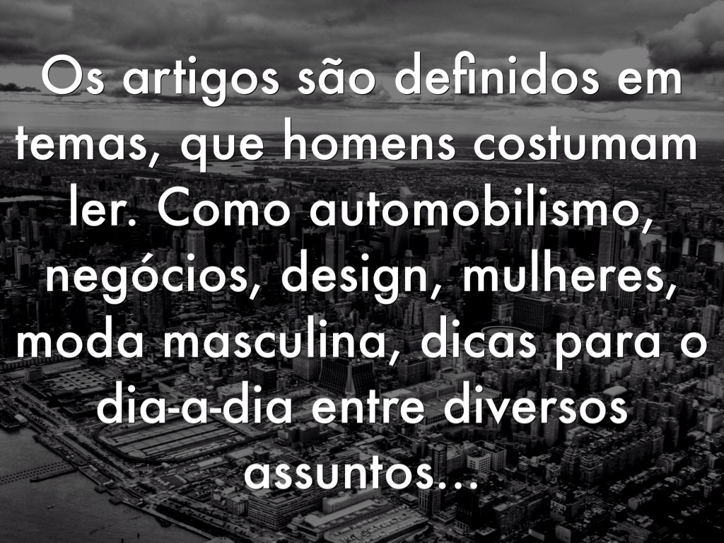 Os artigos são definidos em temas, que homens costumam ler. Como automobilismo, negócios, design, mulheres, moda masculina, dicas para o dia-a-dia entre diversos assuntos...