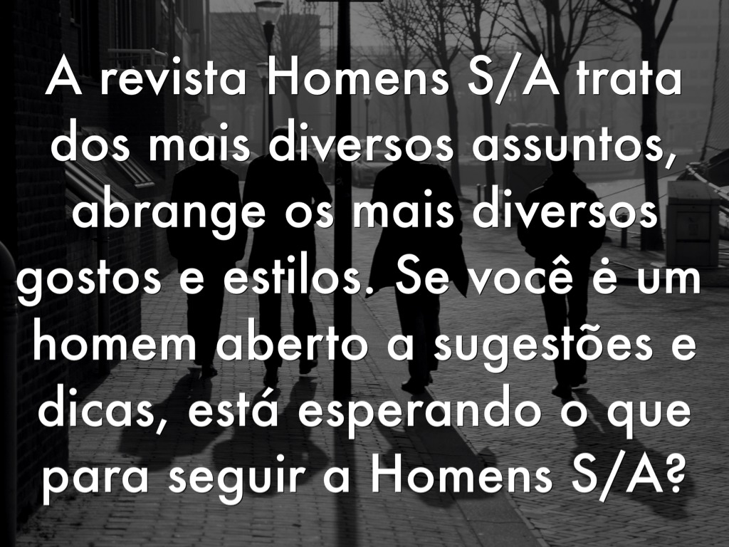 A revista Homens S/A trata dos mais diversos assuntos, abrange os mais diversos gostos e estilos. Se você ė um homem aberto a sugestões e dicas, está esperando o que para seguir a Homens S/A?