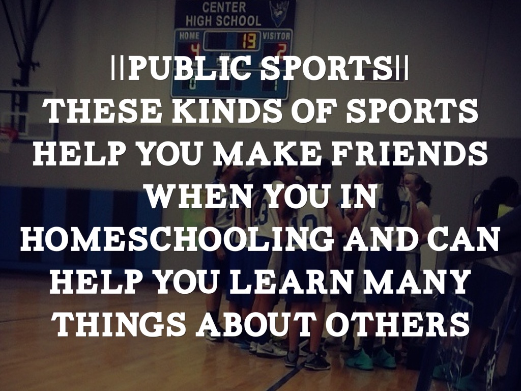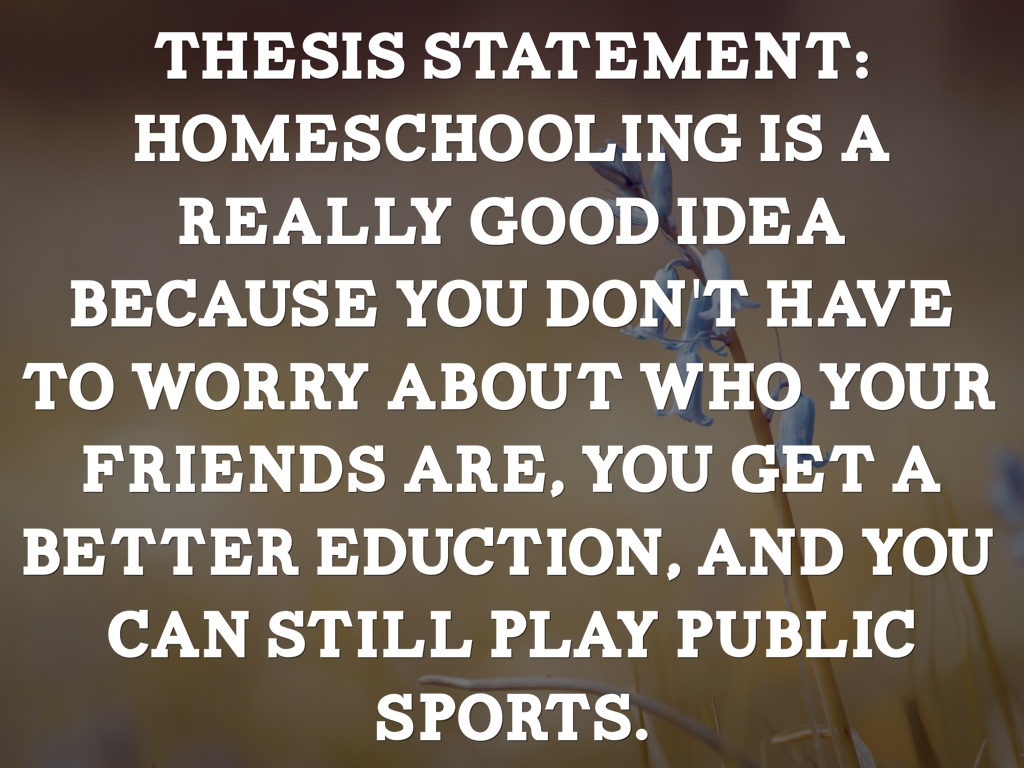 Thesis statement: Homeschooling is a really good idea because you don't have to worry about who your friends are, you get a better eduction, and you can still play public sports.