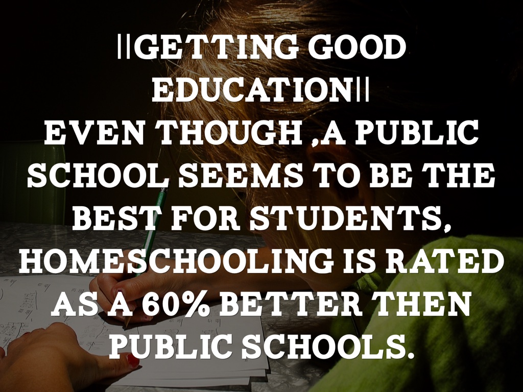 ||Getting good education|| Public or private schools distract you more then homeschooling and schools don't need to be distracted when it comes to school.