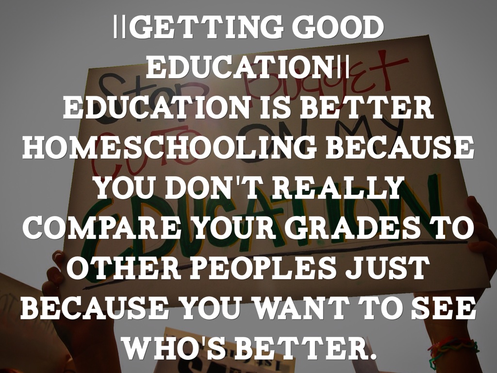 ||Getting good education|| Education is better homeschooling because you don't really compare your grades to other peoples just because you want to see who's better.