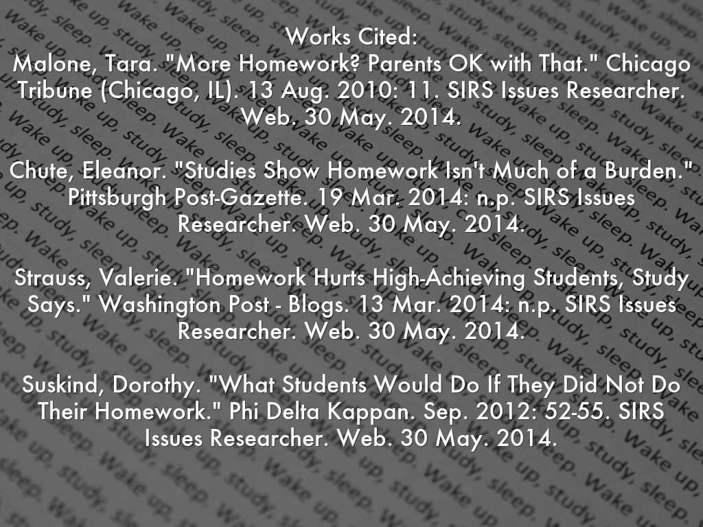 Works Cited: Malone, Tara. "More Homework? Parents OK with That." Chicago Tribune (Chicago, IL). 13 Aug. 2010: 11. SIRS Issues Researcher. Web. 30 May. 2014.