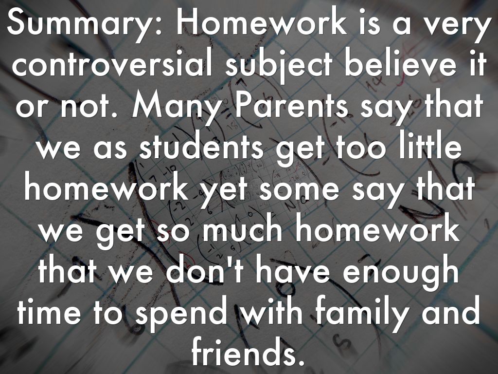 Summary: Homework is a very controversial subject believe it or not. Many Parents say that we as students get too little homework yet some say that we get so much homework that we don't have enough time to spend with family and friends.
