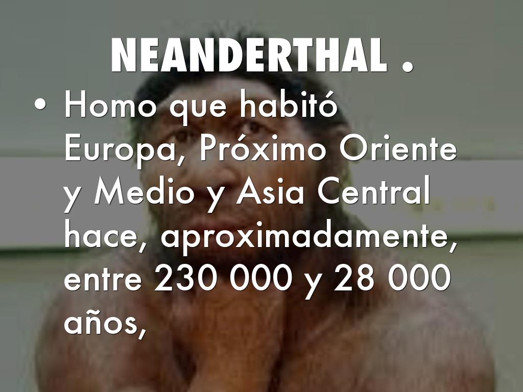 El hombre de Neandertal es una especie extinta del género Homo que habitó Europa, Próximo Oriente y Medio y Asia Central hace, aproximadamente, entre 230 000 y 28 000 años, durante el final del Pleistoceno medio y casi todo el superior.