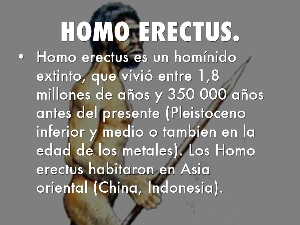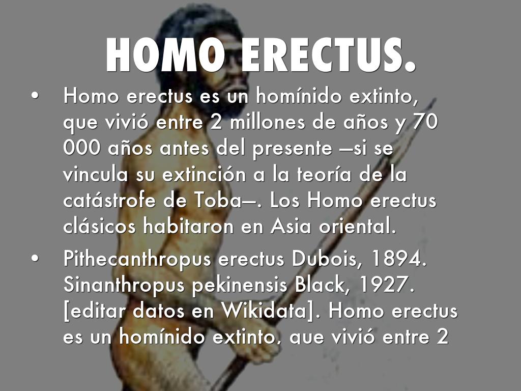Pithecanthropus erectus Dubois, 1894. Sinanthropus pekinensis Black, 1927. [editar datos en Wikidata]. Homo erectus es un homínido extinto, que vivió entre 2 millones de años y 70 000 años antes del presente.