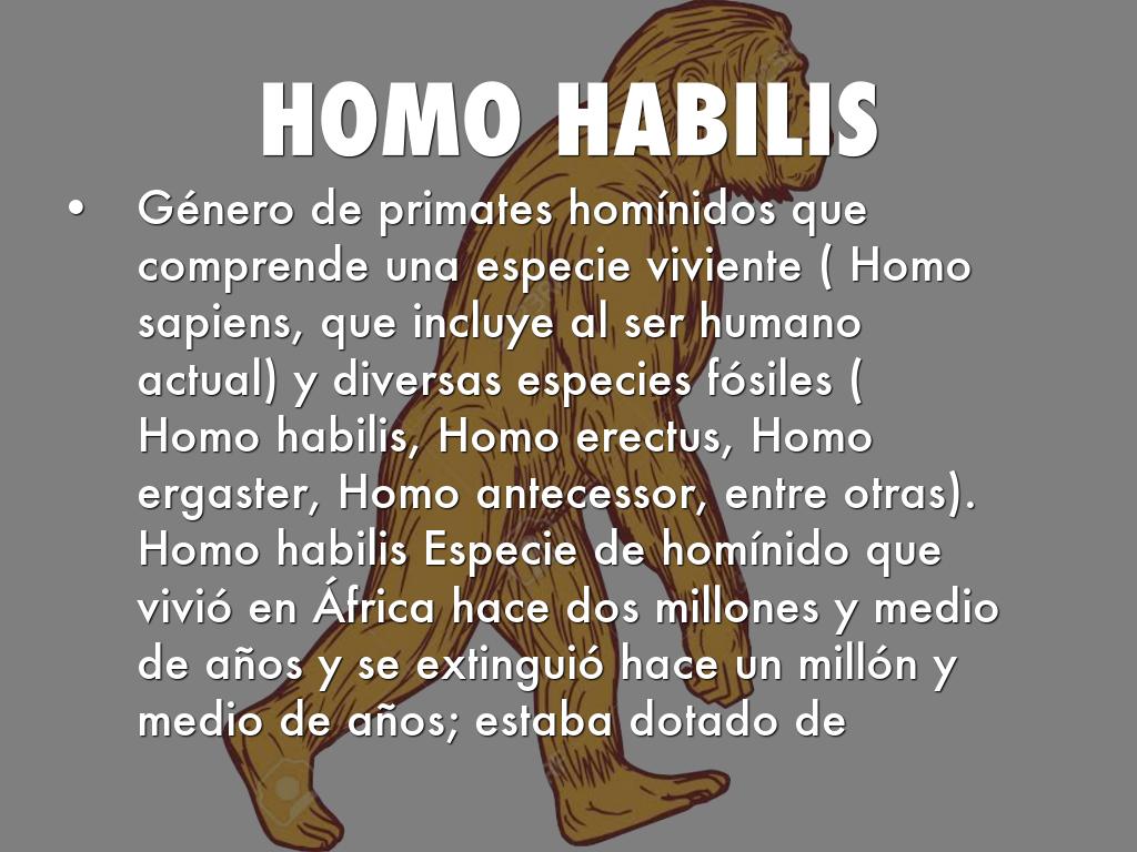 Homo habilis Especie de homínido que vivió en África hace dos millones y medio de años y se extinguió hace un millón y medio de años; estaba dotado de grandes mandíbulas, tenía una capacidad craneal de 770 cm3 y una alimentación omnívora; fue la primera especie capaz de fabricar herramientas de piedra.