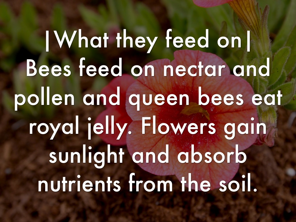 Bees feed on nectar and pollen and queen bees eat royal jelly. Flowers gain sunlight and absorb nutrients from the soil.