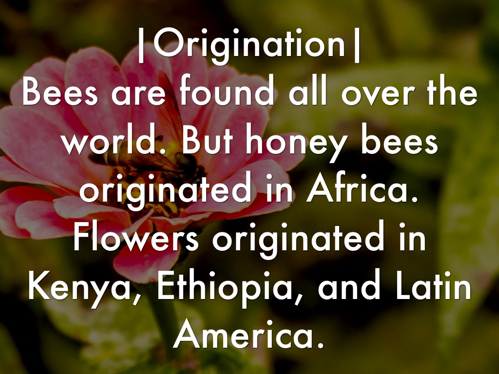 Bees are found all over the world. But honey bees originated in Africa. Flowers originated in Kenya, Ethiopia, and Latin America.