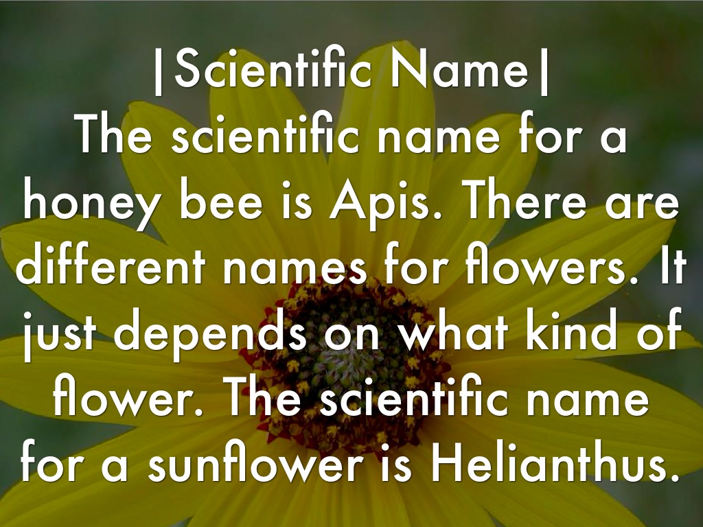 The scientific name for a honey bee is Apis. There are different names for flowers. It just depends on what kind of flower. The scientific name for a sunflower is Helianthus.