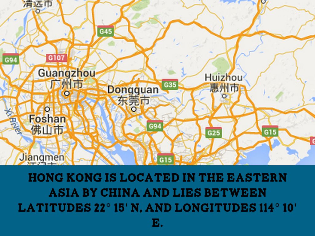 Hong Kong is located in the Eastern Asia by China and lies between latitudes 22° 15' N, and longitudes 114° 10' E.