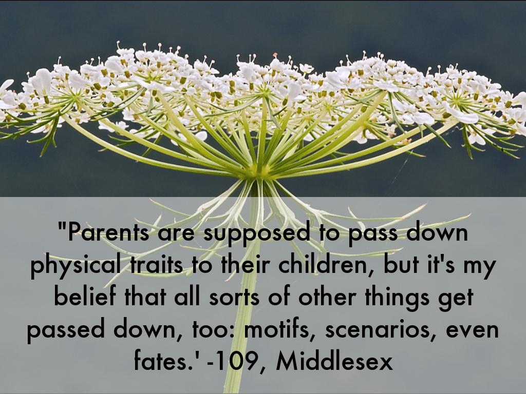 "Parents are supposed to pass down physical traits to their children, but it's my belief that all sorts of other things get passed down, too: motifs, scenarios, even fates.' -109, Middlesex