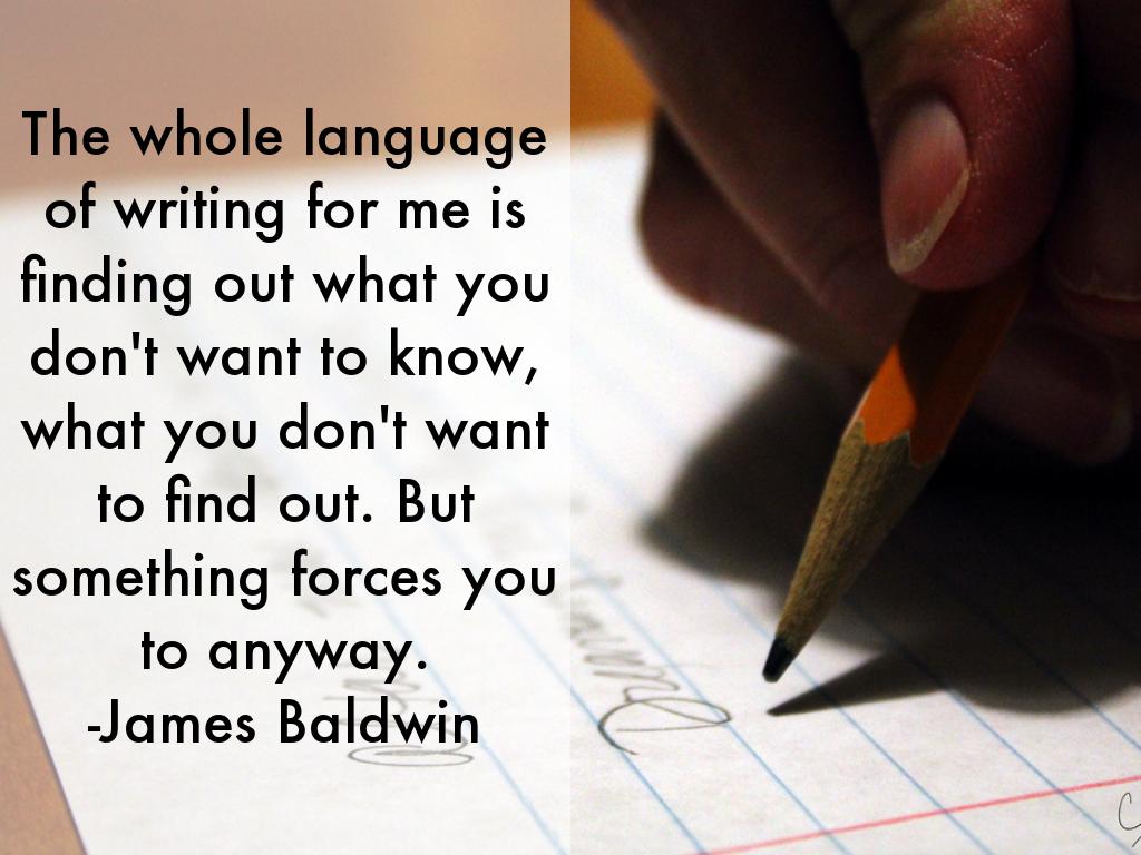 The whole language of writing for me is finding out what you don't want to know, what you don't want to find out. But something forces you to anyway. -James Baldwin
