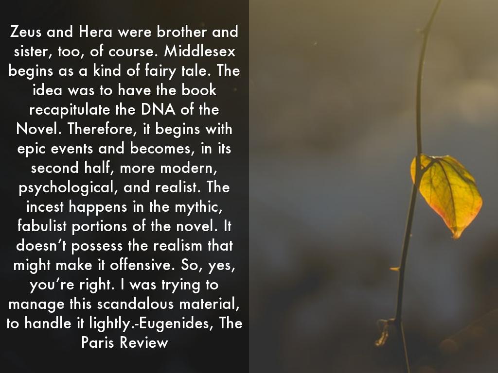 Zeus and Hera were brother and sister, too, of course. Middlesex begins as a kind of fairy tale. The idea was to have the book recapitulate the DNA of the Novel. Therefore, it begins with epic events and becomes, in its second half, more modern, psychological, and realist. The incest happens in the mythic, fabulist portions of the novel. It doesn’t possess the realism that might make it offensive. So, yes, you’re right. I was trying to manage this scandalous material, to handle it lightly.-Eugenides, The Paris Review