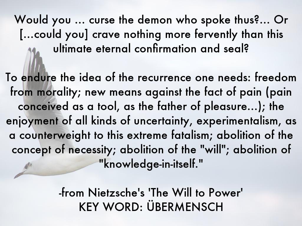 To endure the idea of the recurrence one needs: freedom from morality; new means against the fact of pain (pain conceived as a tool, as the father of pleasure...); the enjoyment of all kinds of uncertainty, experimentalism, as a counterweight to this extreme fatalism; abolition of the concept of necessity; abolition of the "will"; abolition of "knowledge-in-itself."