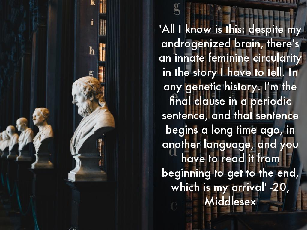 'All I know is this: despite my androgenized brain, there's an innate feminine circularity in the story I have to tell. In any genetic history. I'm the final clause in a periodic sentence, and that sentence begins a long time ago, in another language, and you have to read it from beginning to get to the end, which is my arrival' -20, Middlesex