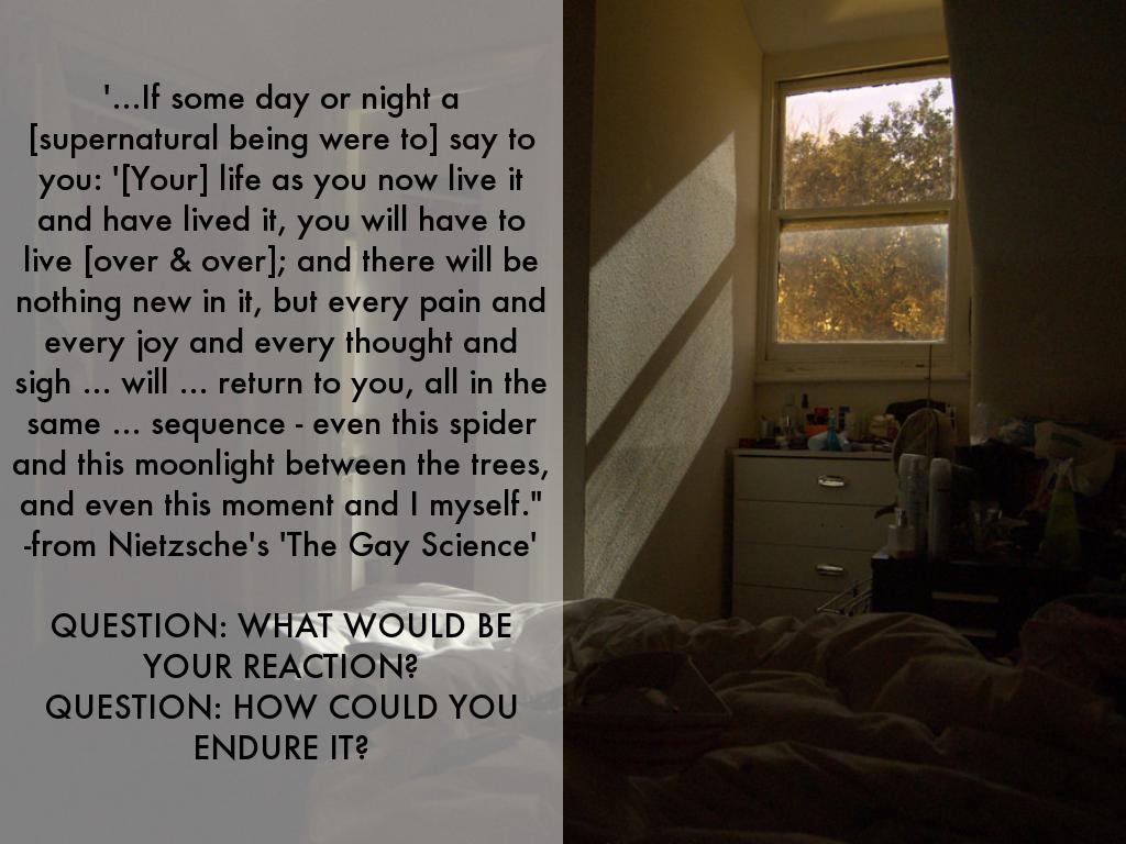'...If some day or night a [supernatural being were to] say to you: '[Your] life as you now live it and have lived it, you will have to live [over & over]; and there will be nothing new in it, but every pain and every joy and every thought and sigh ... will ... return to you, all in the same ... sequence - even this spider and this moonlight between the trees, and even this moment and I myself." -from Nietzsche's 'The Gay Science'
