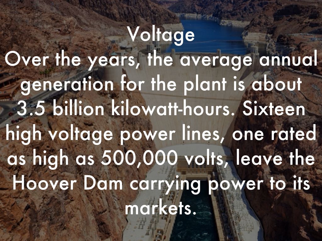 Over the years, the average annual generation for the plant is about 3.5 billion kilowatt-hours. Sixteen high voltage power lines, one rated as high as 500,000 volts, leave the Hoover Dam carrying power to its markets.