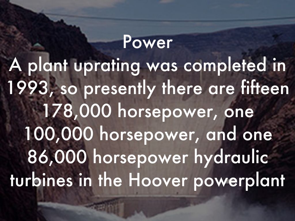 A plant uprating was completed in 1993, so presently there are fifteen 178,000 horsepower, one 100,000 horsepower, and one 86,000 horsepower hydraulic turbines in the Hoover powerplant