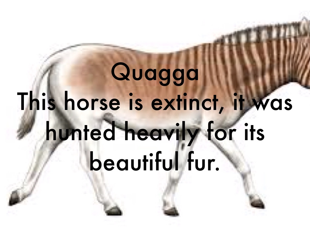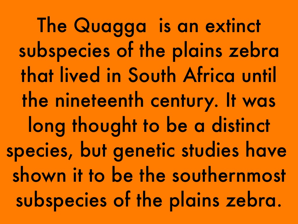 The Quagga is an extinct subspecies of the plains zebra that lived in South Africa until the nineteenth century. It was long thought to be a distinct species, but genetic studies have shown it to be the southernmost subspecies of the plains zebra.