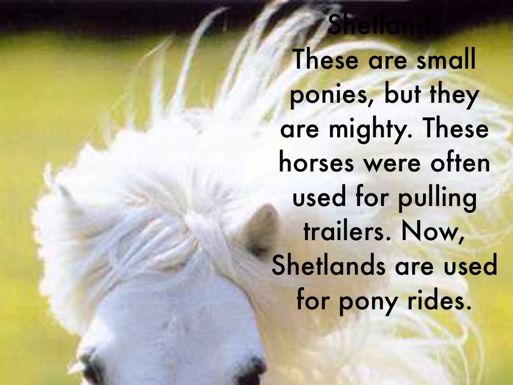 These are small ponies, but they are mighty. These horses were often used for pulling trailers. Now, Shetlands are used for pony rides.