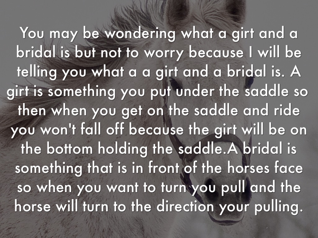 You may be wondering what a girt and a bridal is but not to worry because I will be telling you what a a girt and a bridal is. A girt is something you put under the saddle so then when you get on the saddle and ride you won't fall off because the girt will be on the bottom holding the saddle.A bridal is something that is in front of the horses face so when you want to turn you pull and the horse will turn to the direction your pulling.