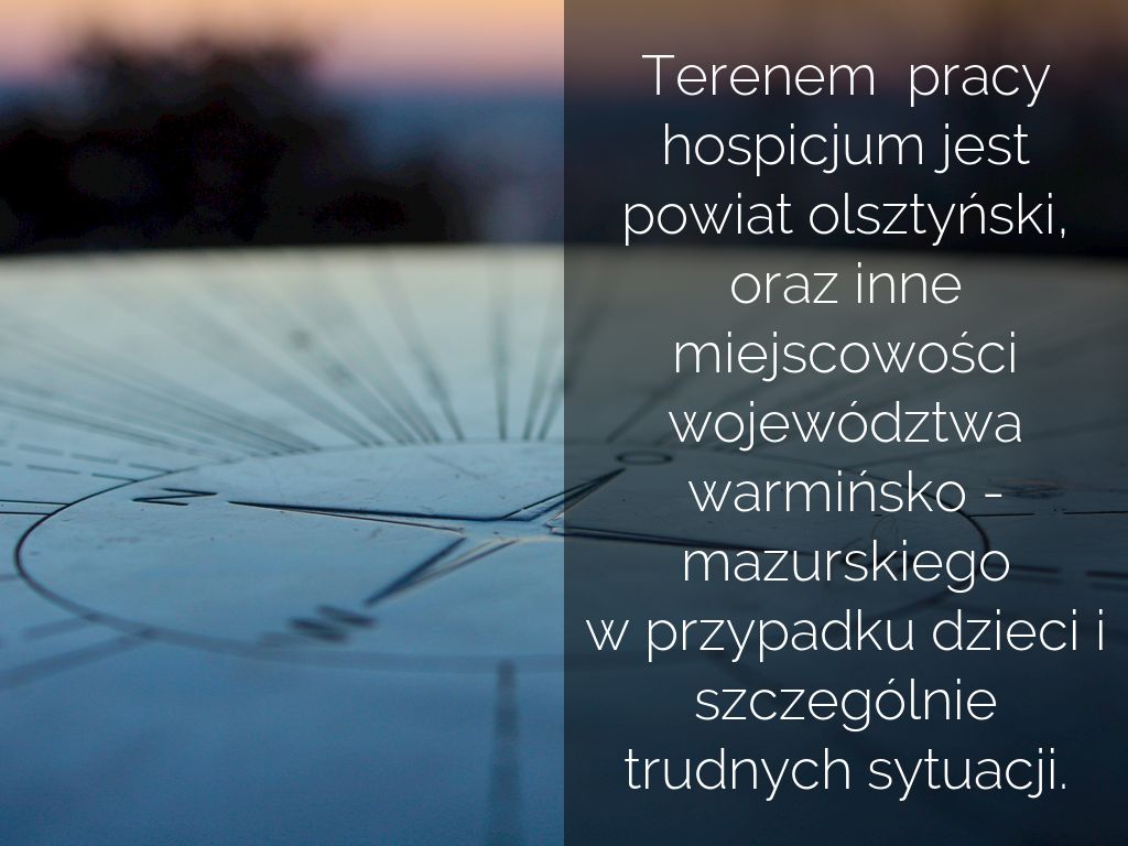 Terenem pracy hospicjum jest powiat olsztyński, oraz inne miejscowości województwa