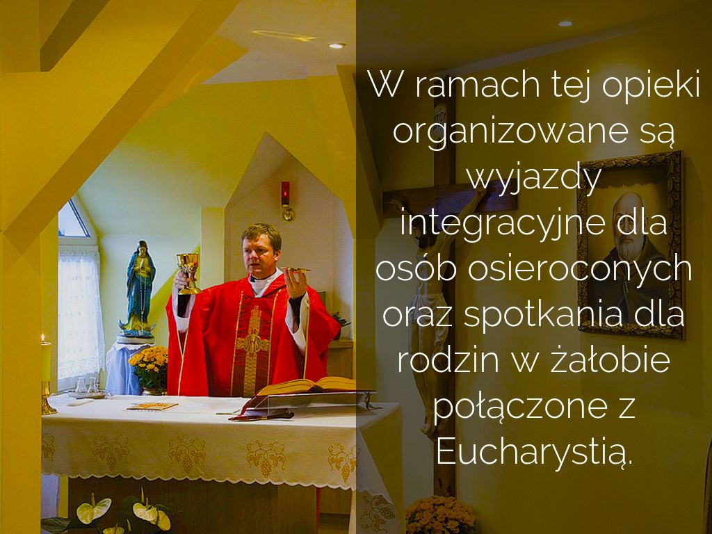 W ramach tej opieki organizowane są wyjazdy integracyjne dla osób osieroconych oraz spotkania dla rodzin w żałobie połączone z Eucharystią.