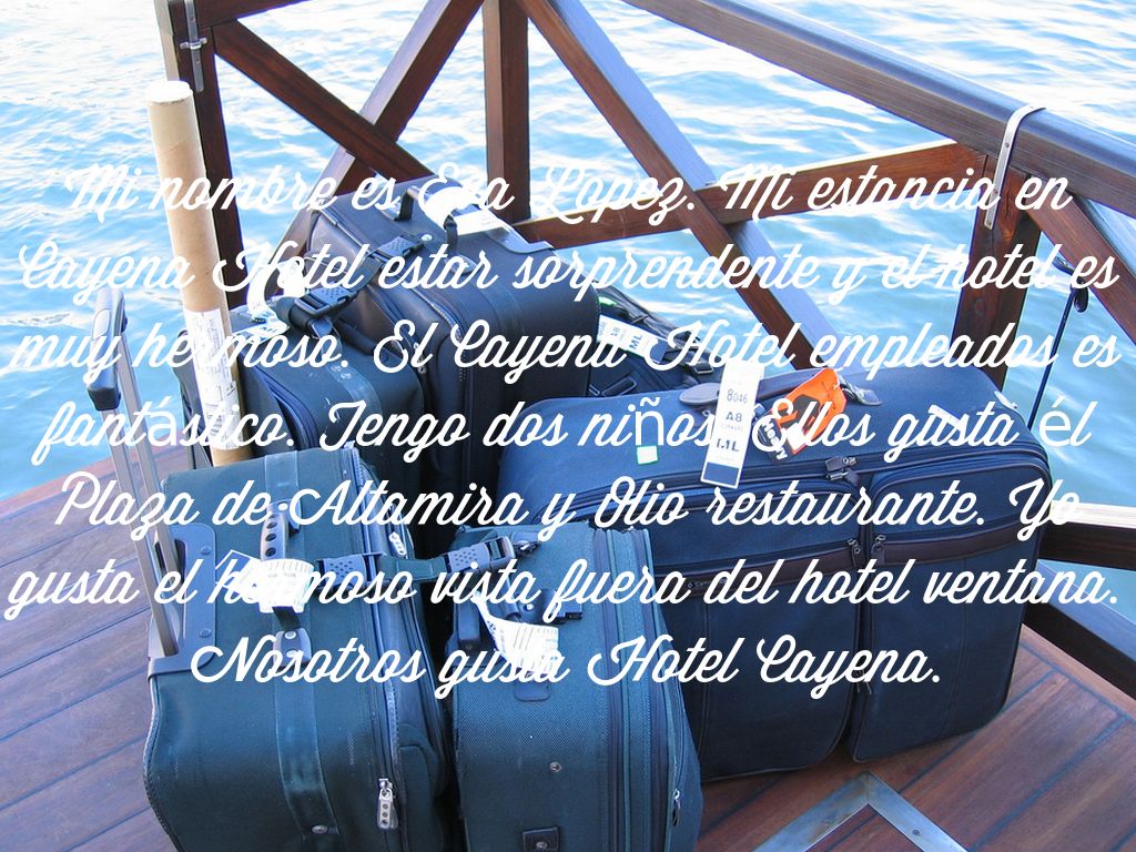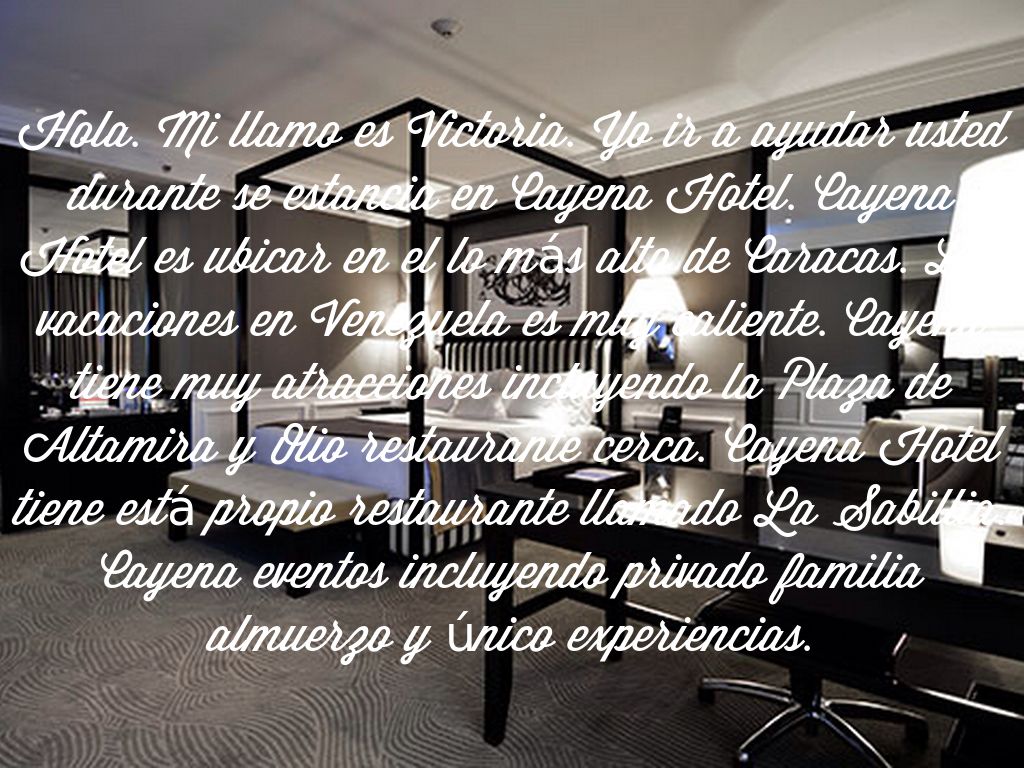 Hola. Mi llamo es Victoria. Yo ir a ayudar usted durante se estancia en Cayena Hotel. Cayena Hotel es ubicar en el lo más alto de Caracas. Los vacaciones en Venezuela es muy caliente. Cayena tiene muy atracciones incluyendo la Plaza de Altamira y Olio restaurante cerca. Cayena Hotel tiene está propio restaurante llamado La Sabillia. Cayena eventos incluyendo privado familia almuerzo y único experiencias.