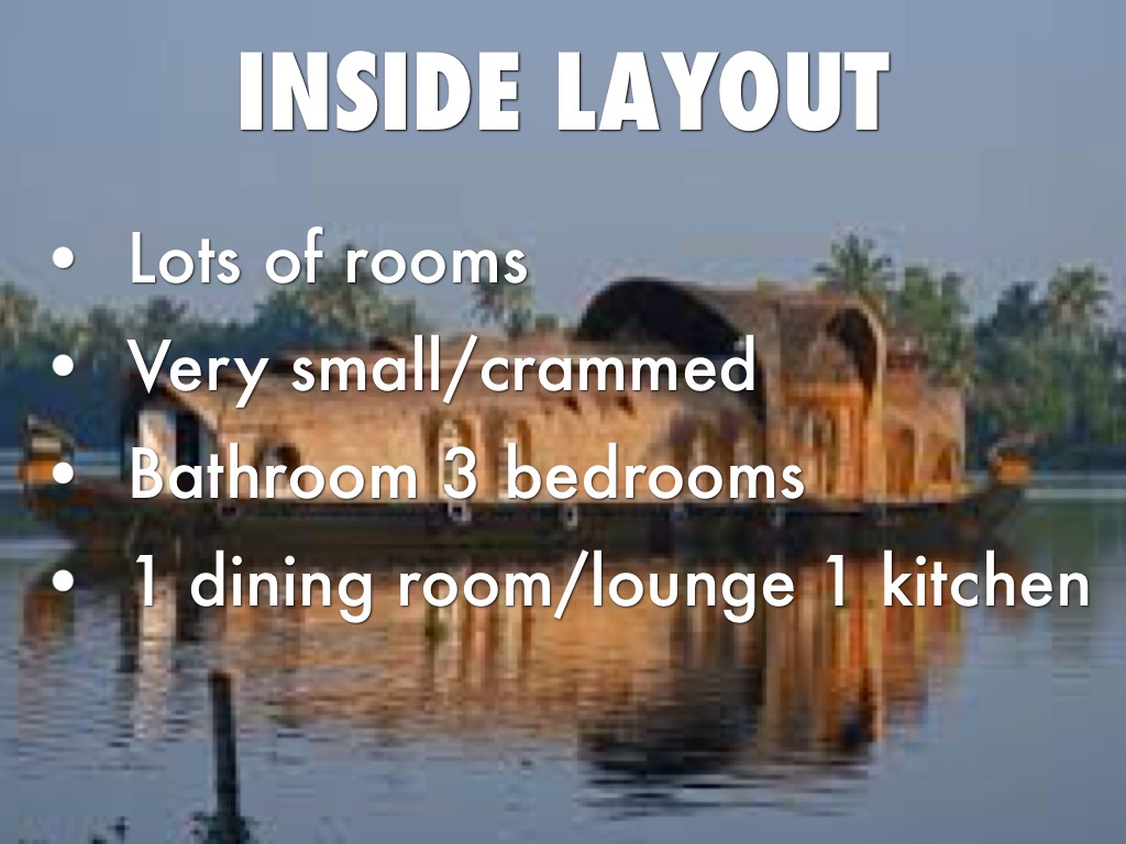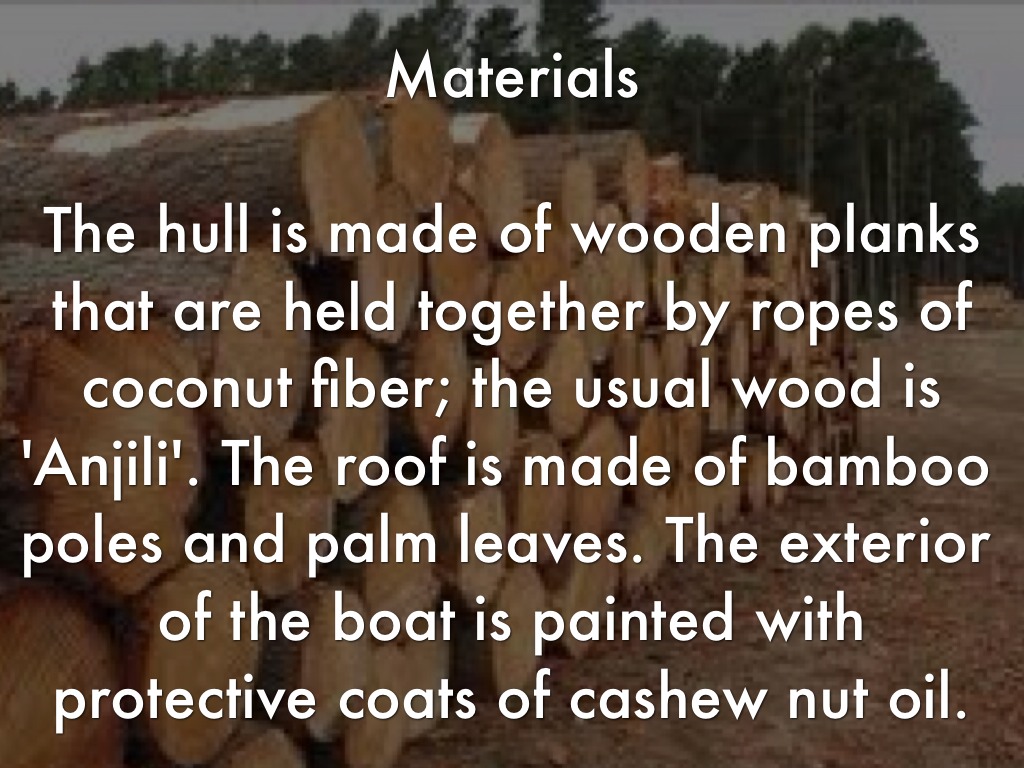 The hull is made of wooden planks that are held together by ropes of coconut fiber; the usual wood is 'Anjili'. The roof is made of bamboo poles and palm leaves. The exterior of the boat is painted with protective coats of cashew nut oil.