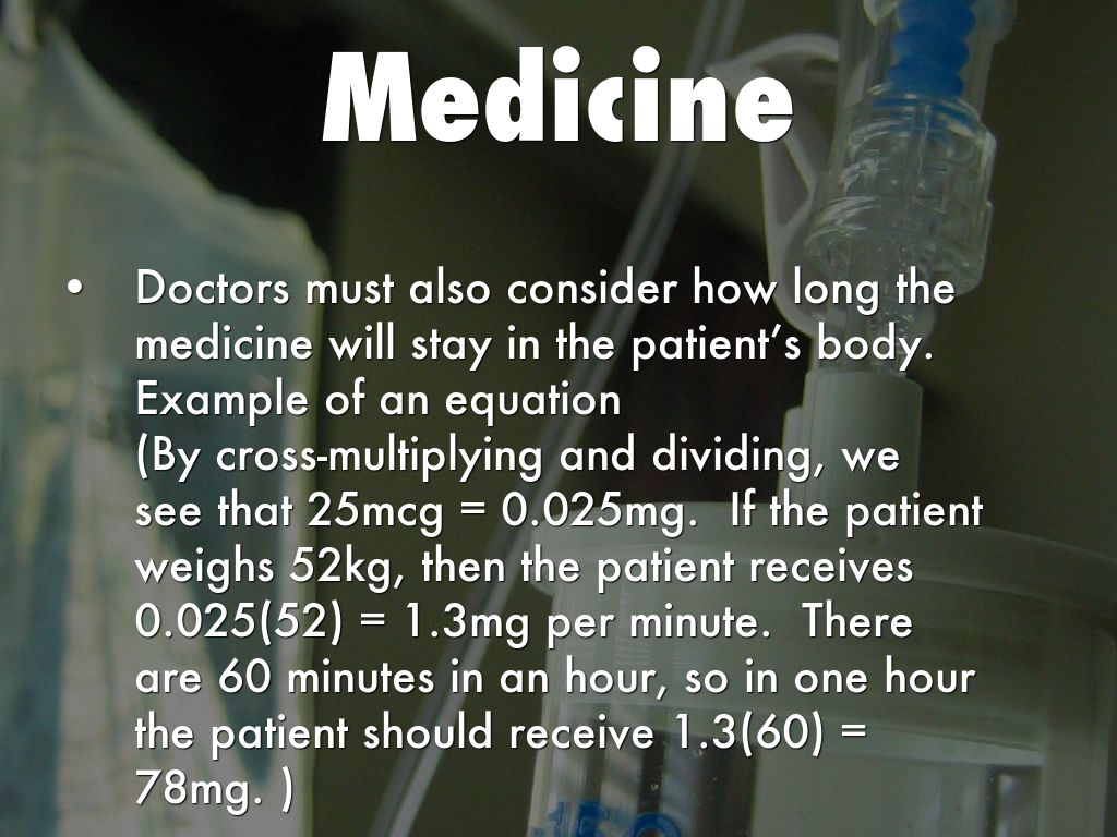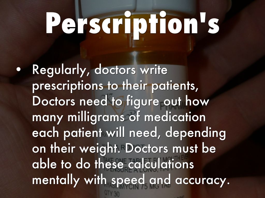 Regularly, doctors write prescriptions to their patients, Doctors need to figure out how many milligrams of medication each patient will need, depending on their weight. Doctors must be able to do these calculations mentally with speed and accuracy.