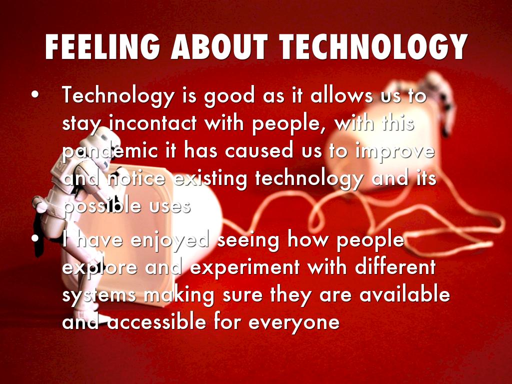 Technology is good as it allows us to stay incontact with people, with this pandemic it has caused us to improve and notice existing technology and its possible uses