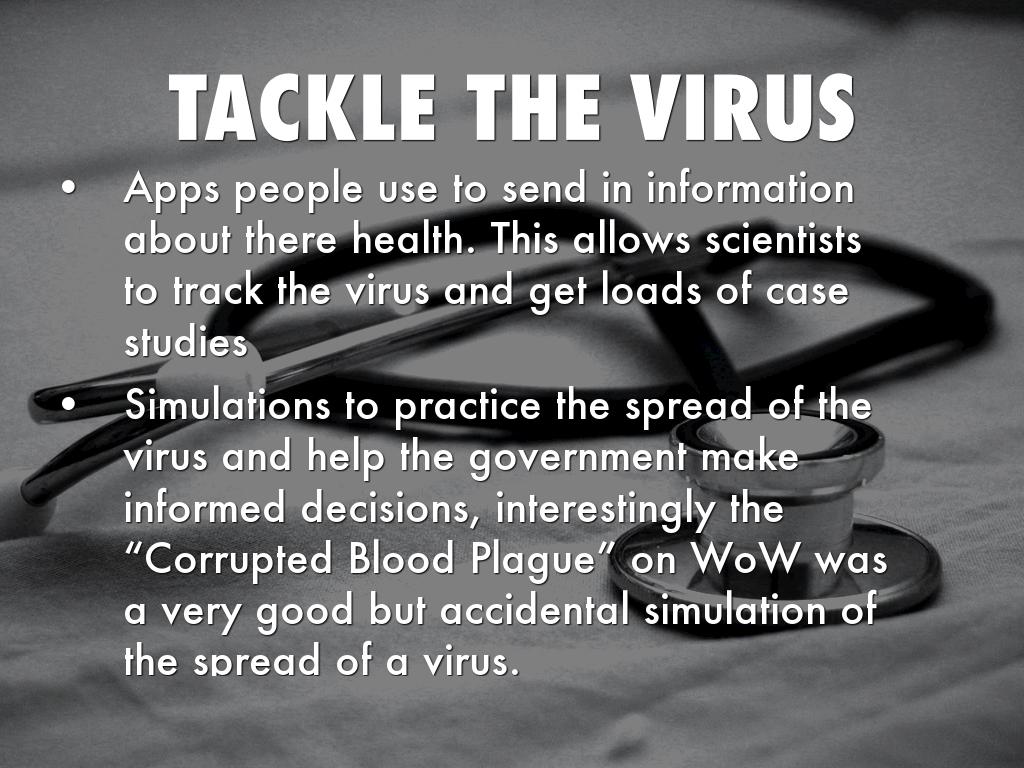 Simulations to practice the spread of the virus and help the government make informed decisions, interestingly the “Corrupted Blood Plague” on WoW was a very good but accidental simulation of the spread of a virus.