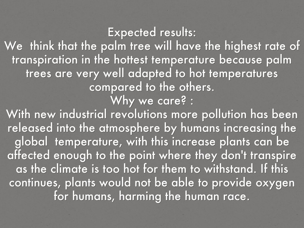 We think that the palm tree will have the highest rate of transpiration in the hottest temperature because palm trees are very well adapted to hot temperatures compared to the others.