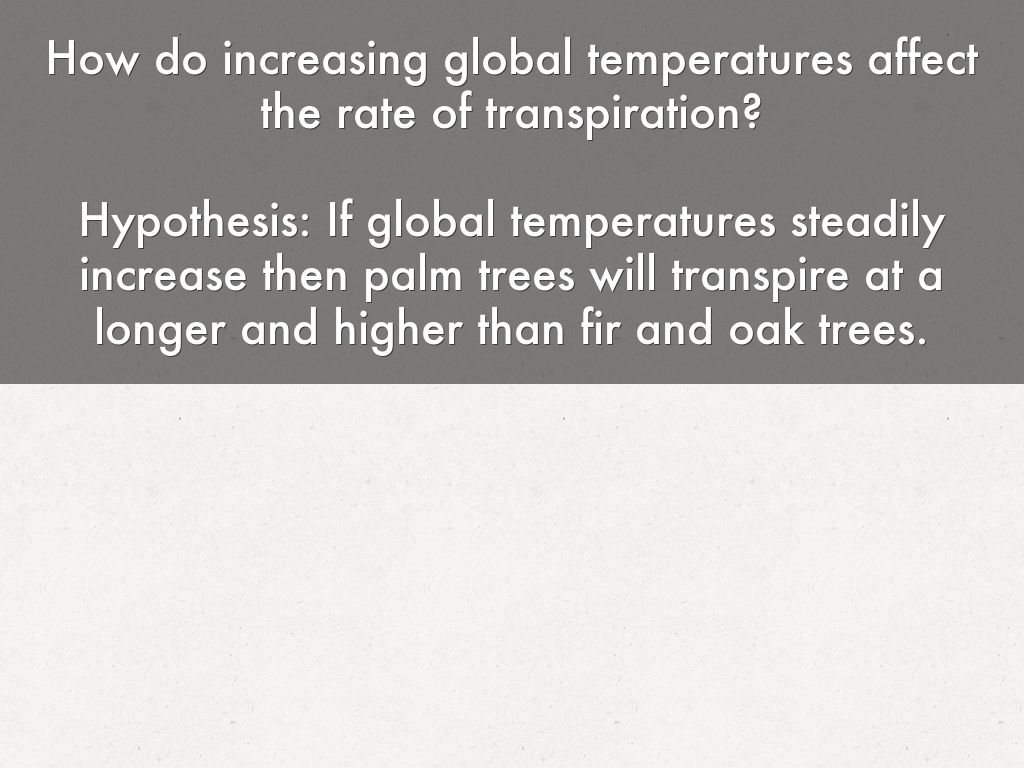 Hypothesis: If global temperatures steadily increase then palm trees will transpire at a longer and higher than fir and oak trees.