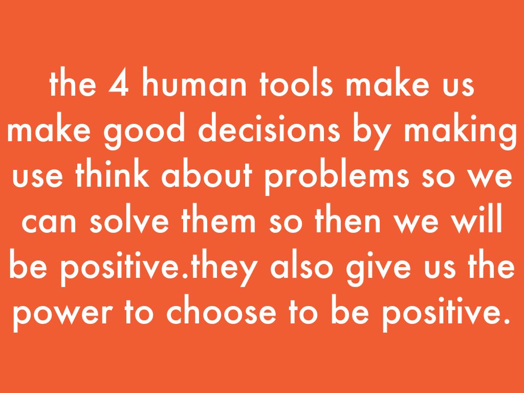 the 4 human tools make us make good decisions by making use think about problems so we can solve them so then we will be positive.they also give us the power to choose to be positive.