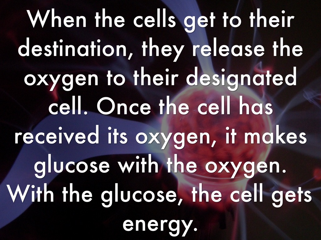 When the cells get to their destination, they release the oxygen to their designated cell. Once the cell has received its oxygen, it makes glucose with the oxygen. With the glucose, the cell gets energy.
