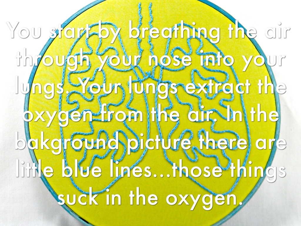 You start by breathing the air through your nose into your lungs. Your lungs extract the oxygen from the air. In the bakground picture there are little blue lines...those things suck in the oxygen.