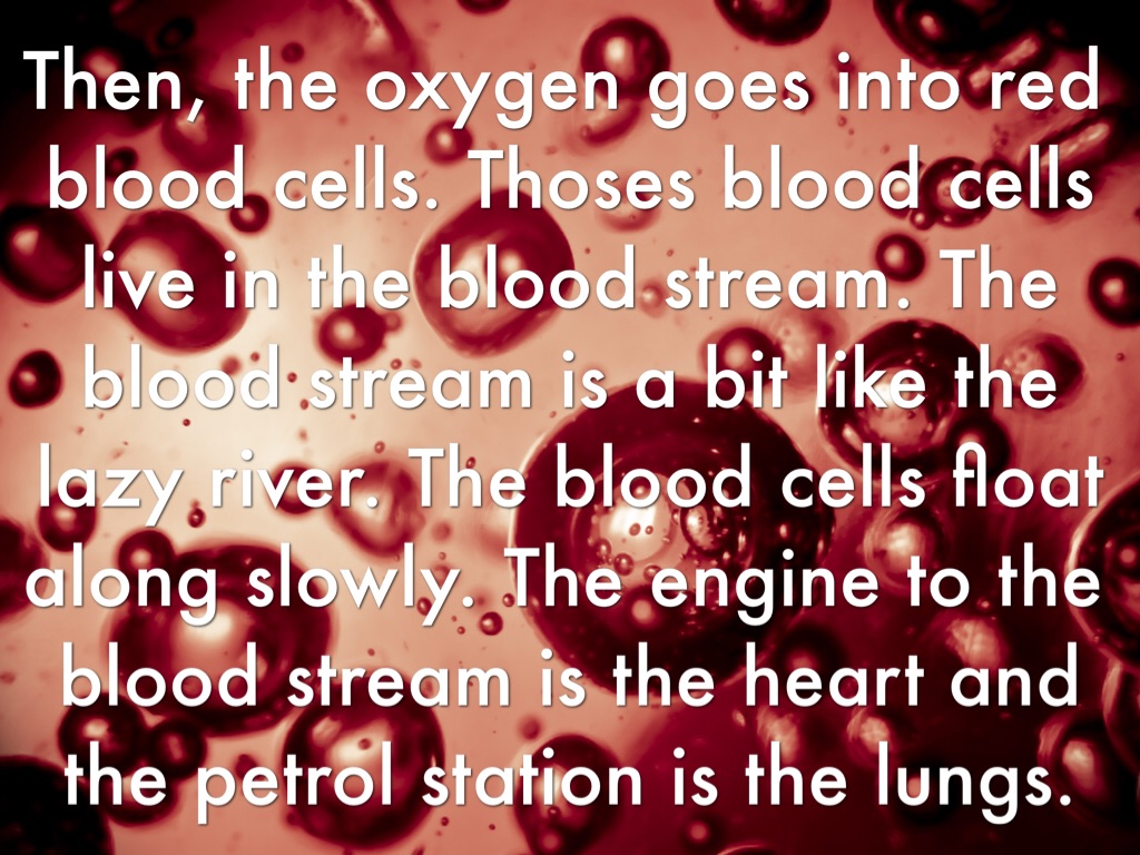 Then, the oxygen goes into red blood cells. Thoses blood cells live in the blood stream. The blood stream is a bit like the lazy river. The blood cells float along slowly. The engine to the blood stream is the heart and the petrol station is the lungs.