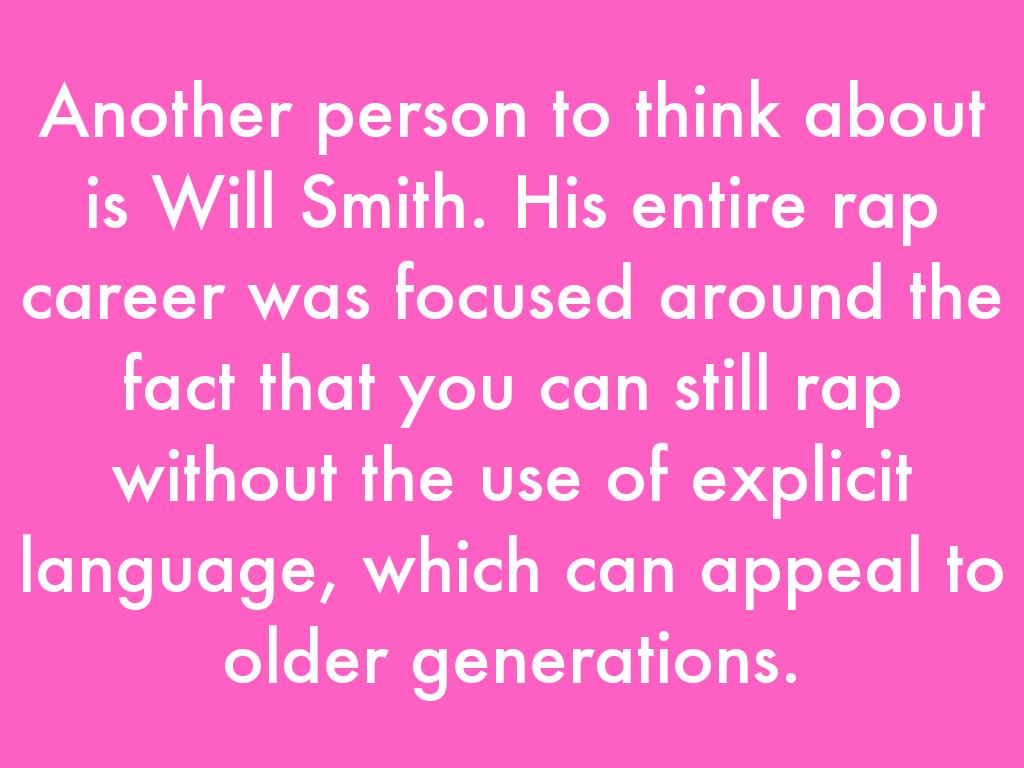 Another person to think about is Will Smith. His entire rap career was focused around the fact that you can still rap without the use of explicit language, which can appeal to older generations.