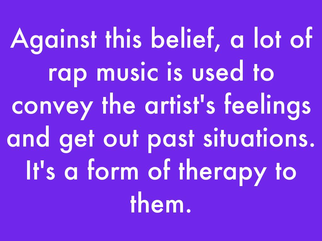 Against this belief, a lot of rap music is used to convey the artist's feelings and get out past situations. It's a form of therapy to them.