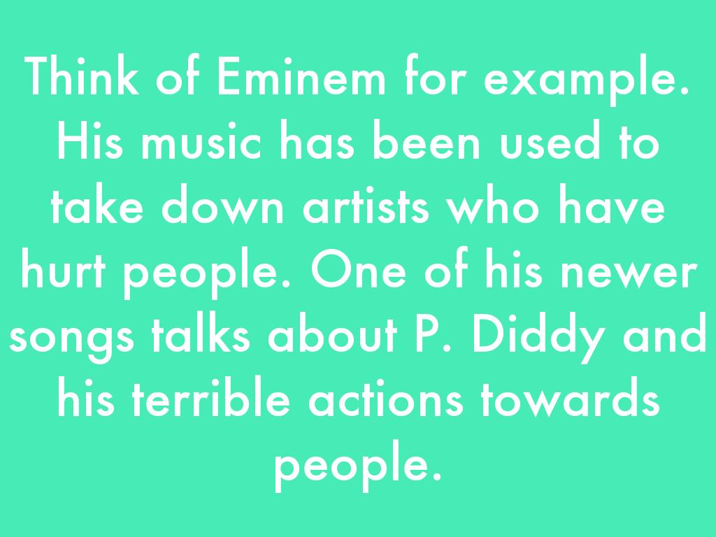 Think of Eminem for example. His music has been used to take down artists who have hurt people. One of his newer songs talks about P. Diddy and his terrible actions towards people.
