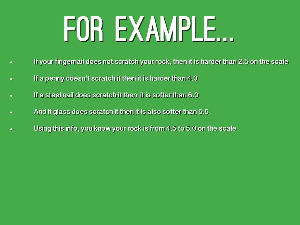 GEOLOGISTS MADE HARDNESS TESTS AS WELL, TO HELP IDENTIFY ROCKS AND THEIR PLACE ON THE SCALE