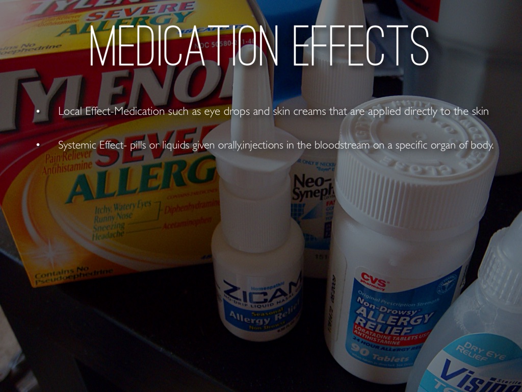 Systemic Effect- pills or liquids given orally,injections in the bloodstream on a specific organ of body.