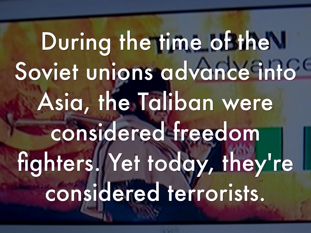 During the time of the Soviet unions advance into Asia, the Taliban were considered freedom fighters. Yet today, they're considered terrorists.