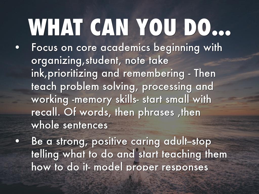 Focus on core academics beginning with organizing,student, note take ink,prioritizing and remembering - Then teach problem solving, processing and working -memory skills- start small with recall. Of words, then phrases ,then whole sentences
