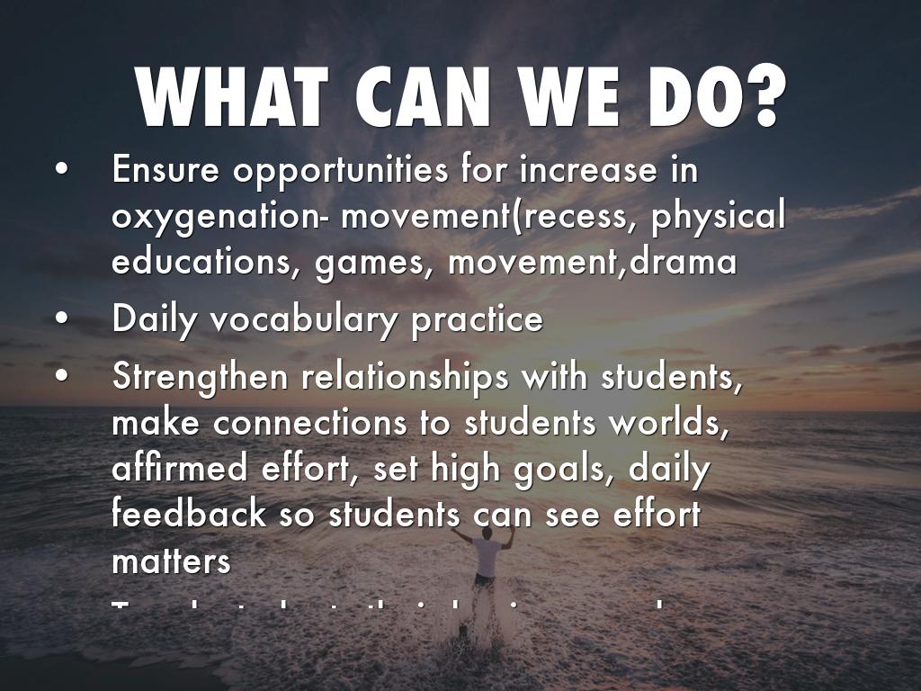 Ensure opportunities for increase in oxygenation- movement(recess, physical educations, games, movement,drama