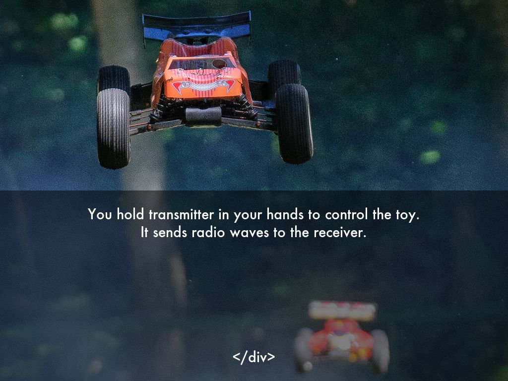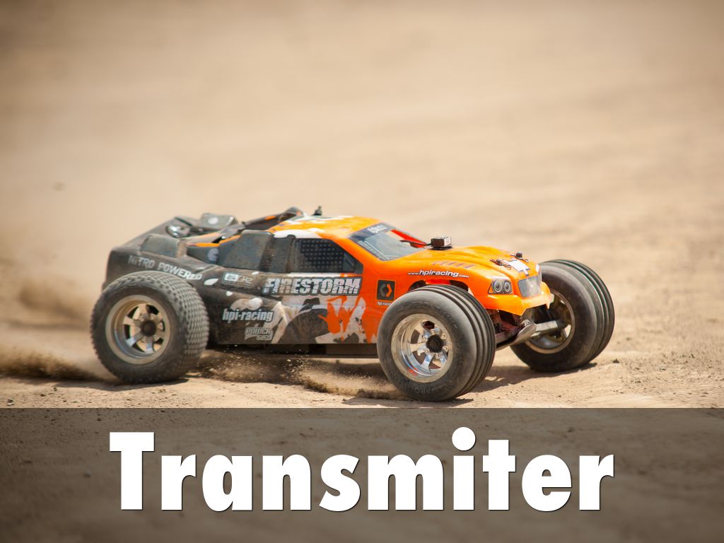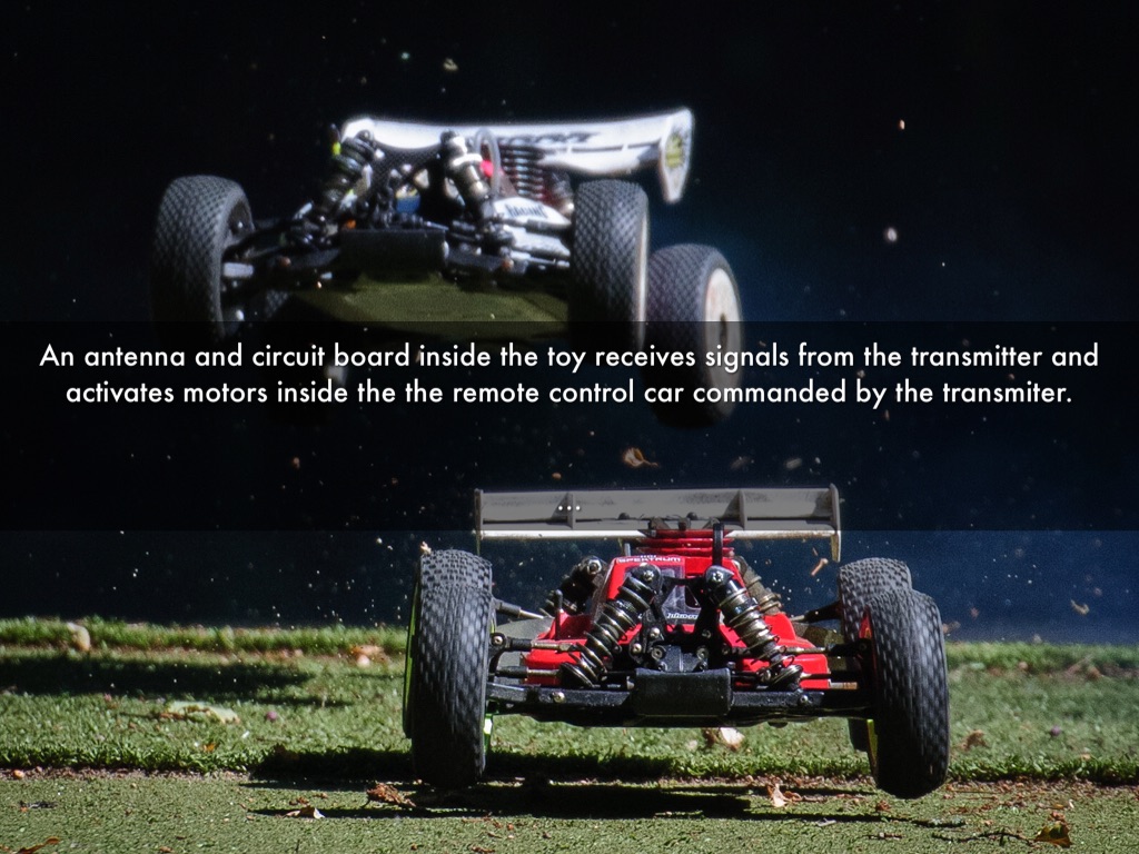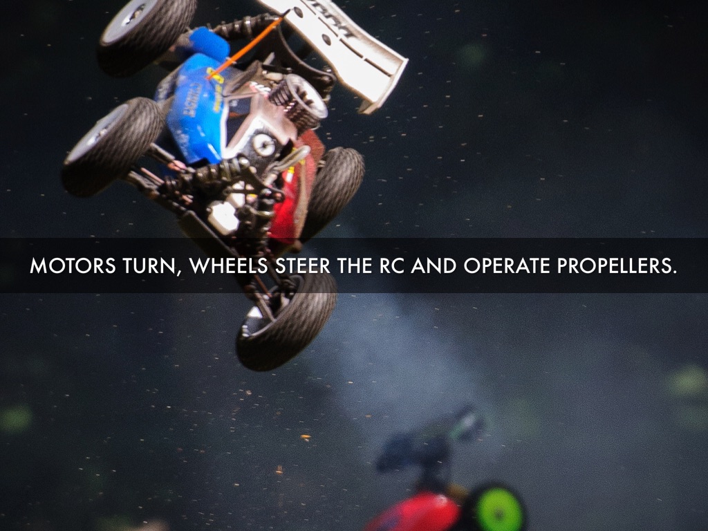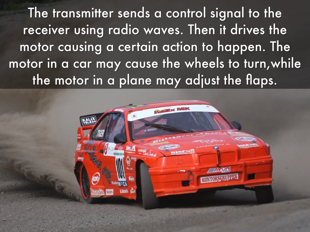 The transmitter sends a control signal to the receiver using radio waves. Then it drives the motor causing a certain action to happen. The motor in a car may cause the wheels to turn,while the motor in a plane may adjust the flaps.